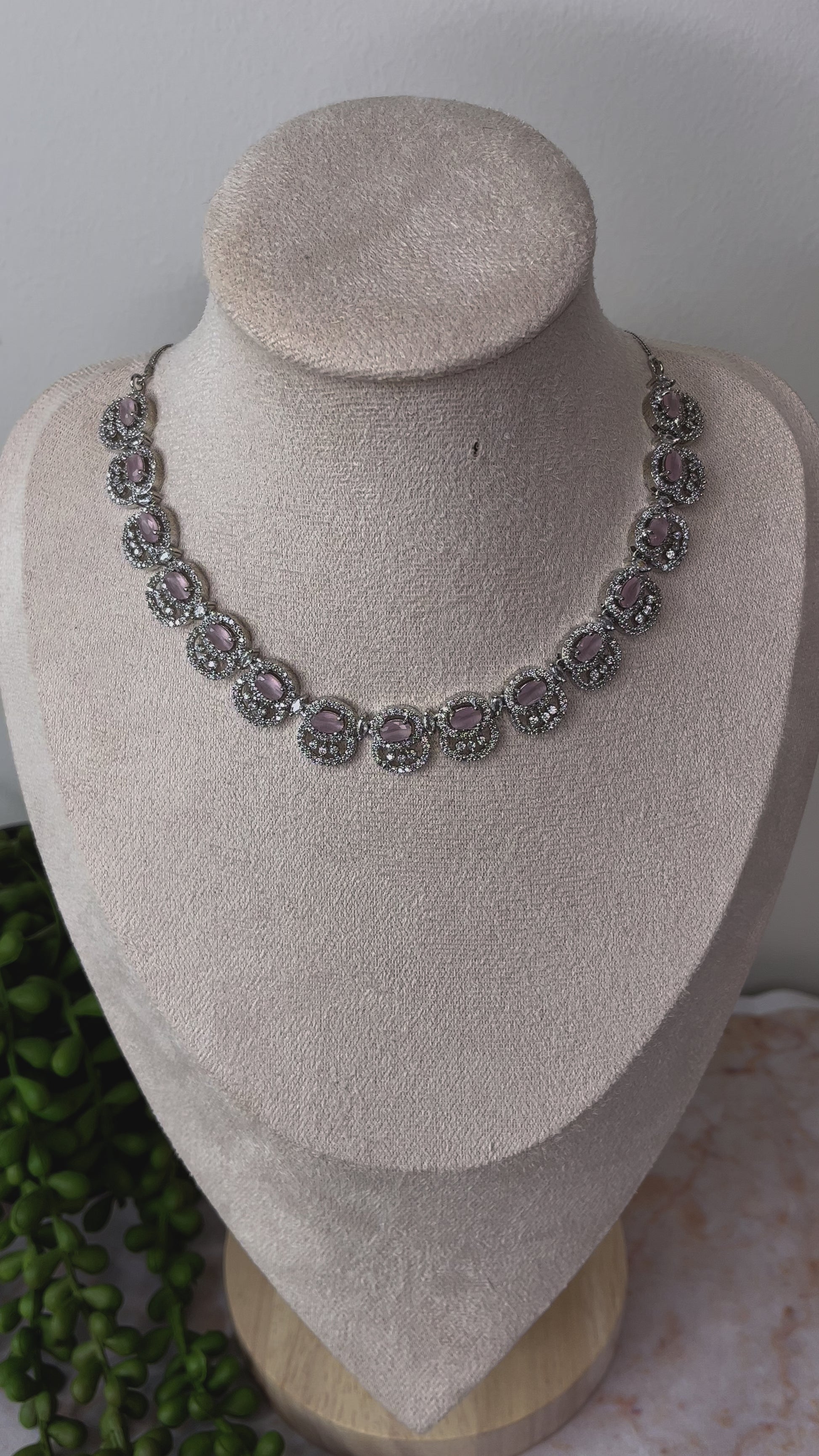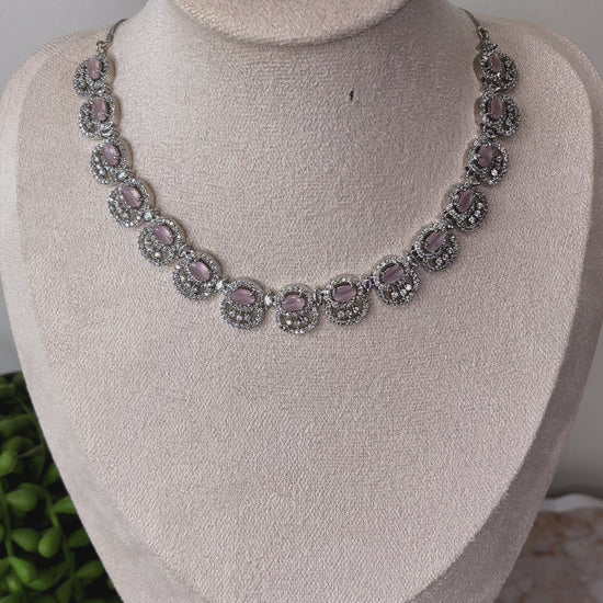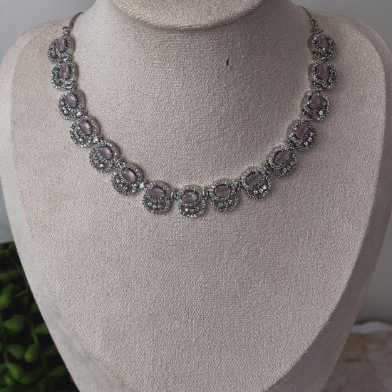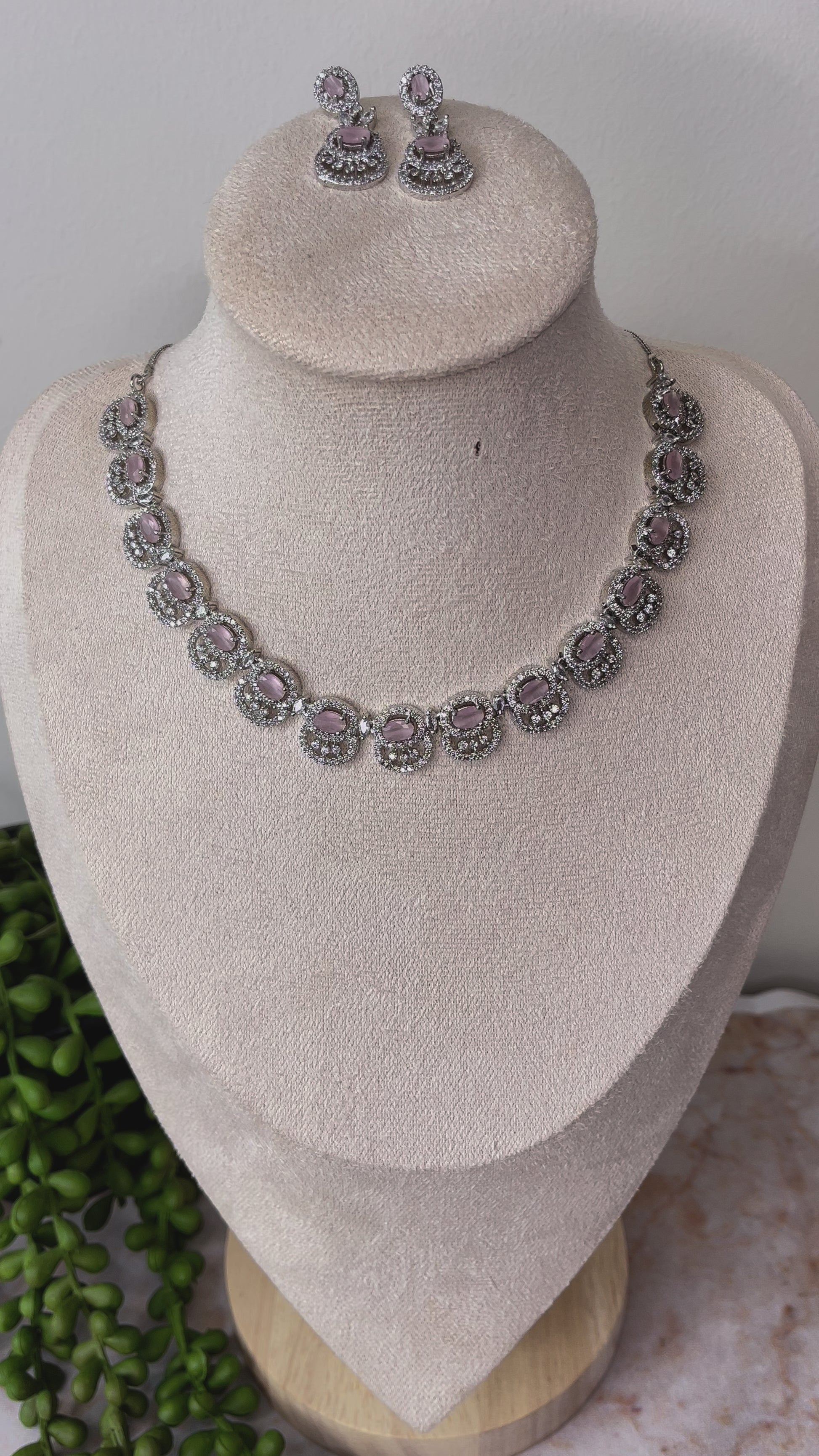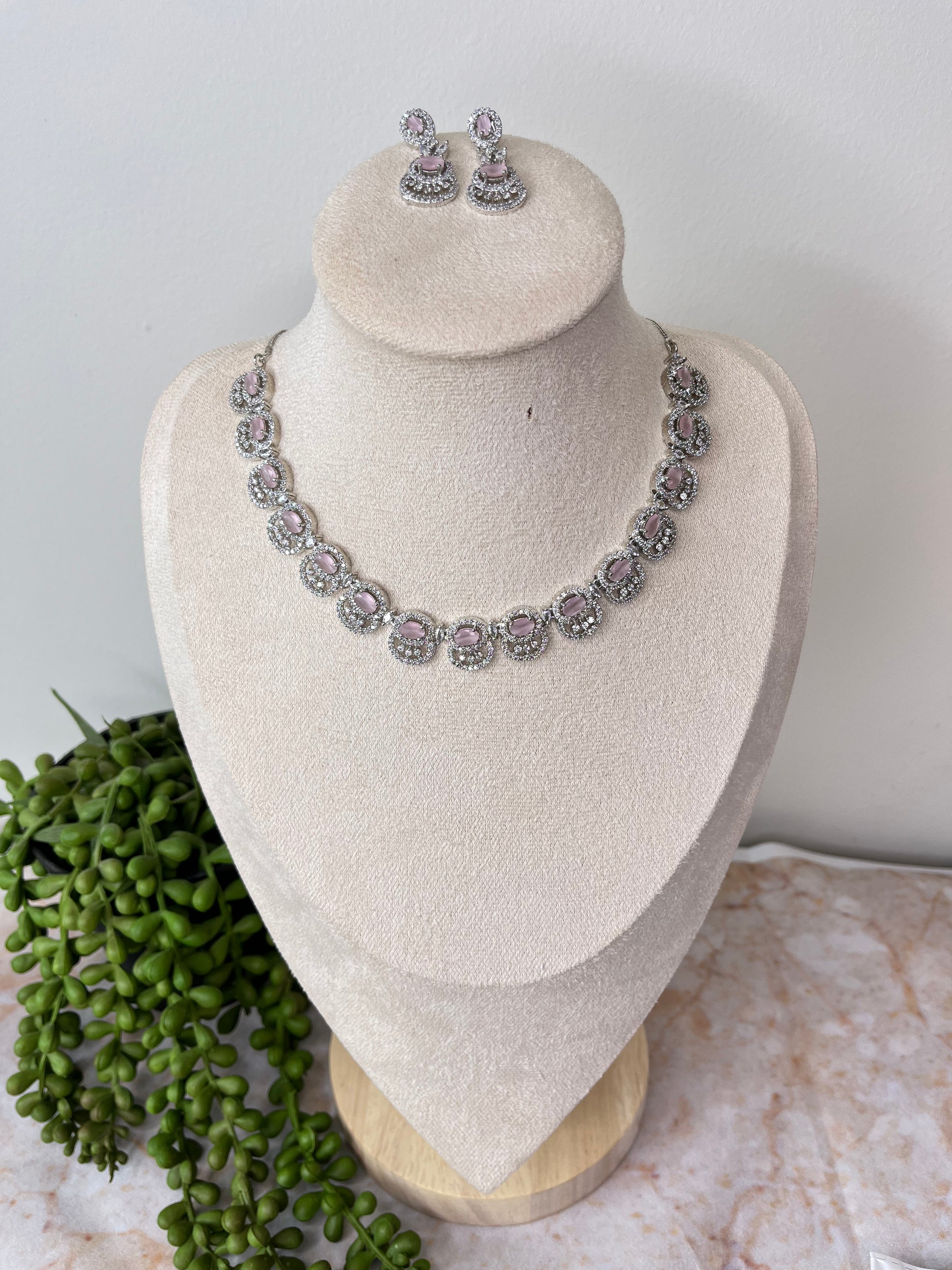 Add a touch of romance and sparkle to your ensemble with this exquisite American diamond set. Featuring a shimmering silver base adorned with radiant pink stones, the necklace and matching earrings blend elegance and charm.
