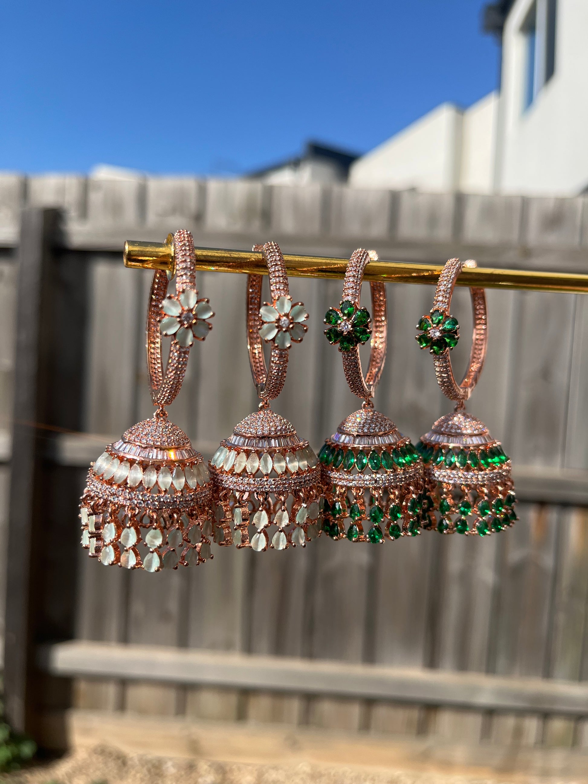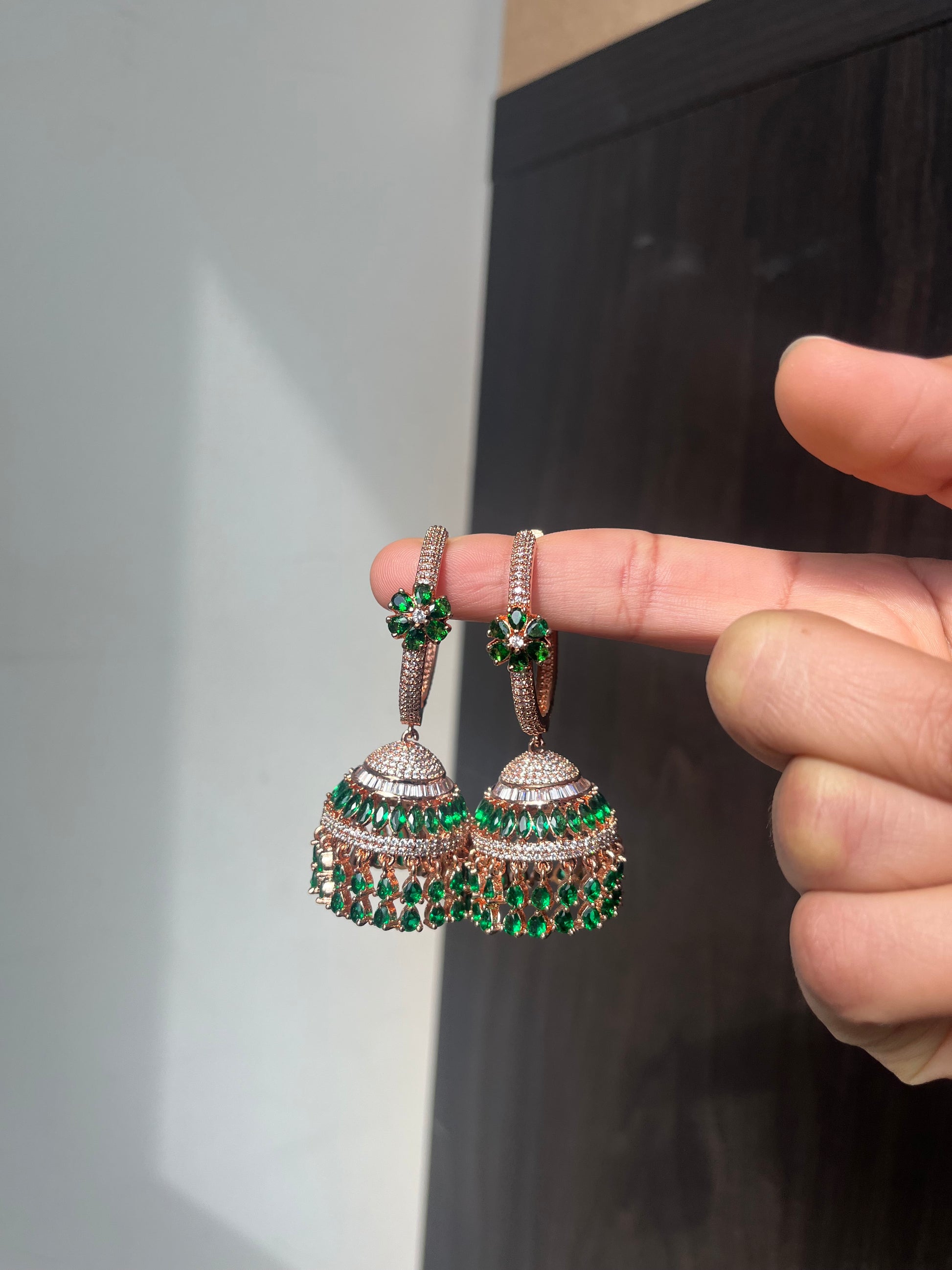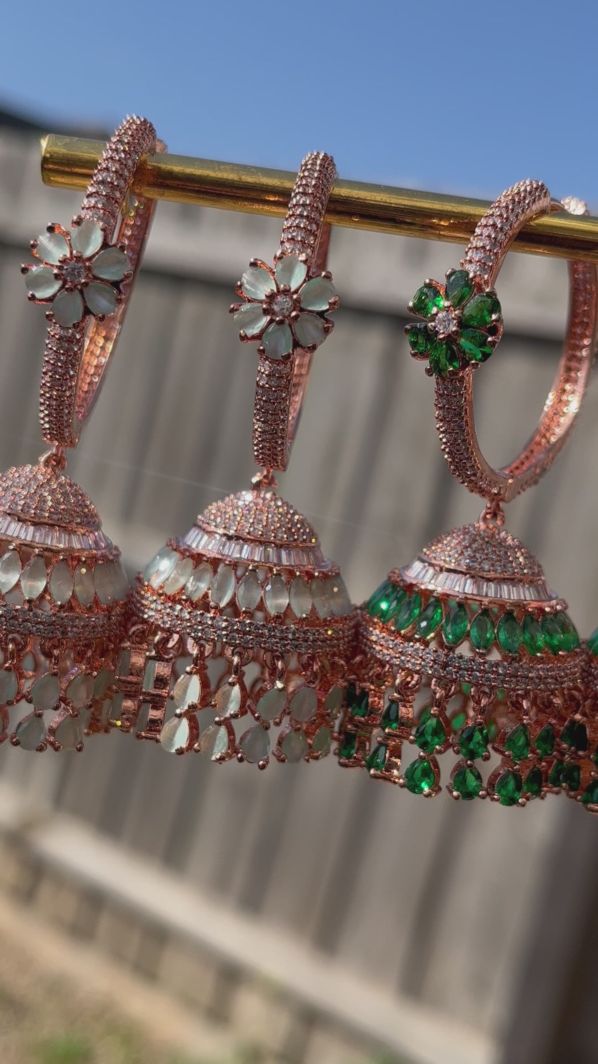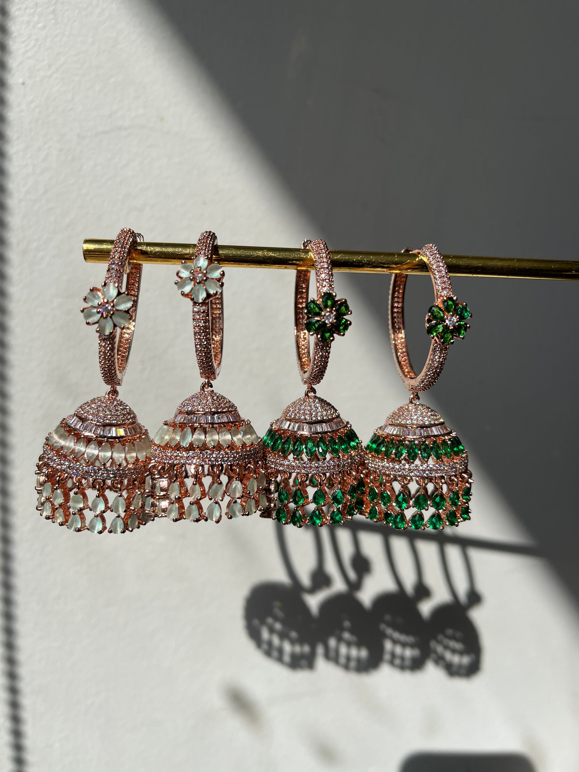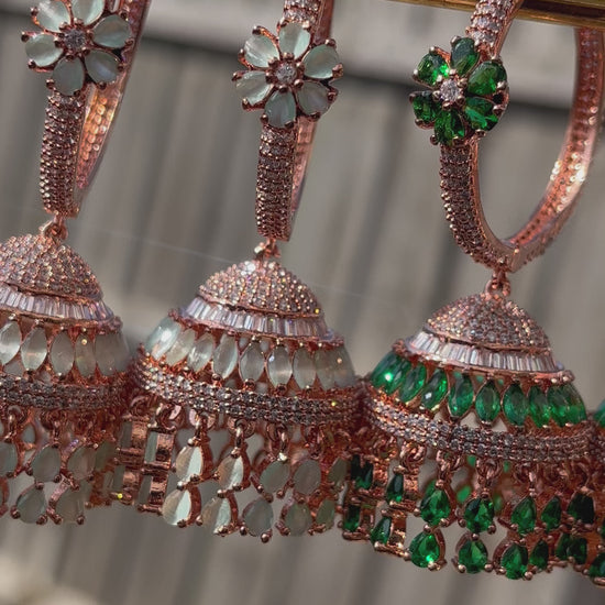 Experience refined elegance with these American diamond Jhumkis in rose gold, perfect for elevating any outfit