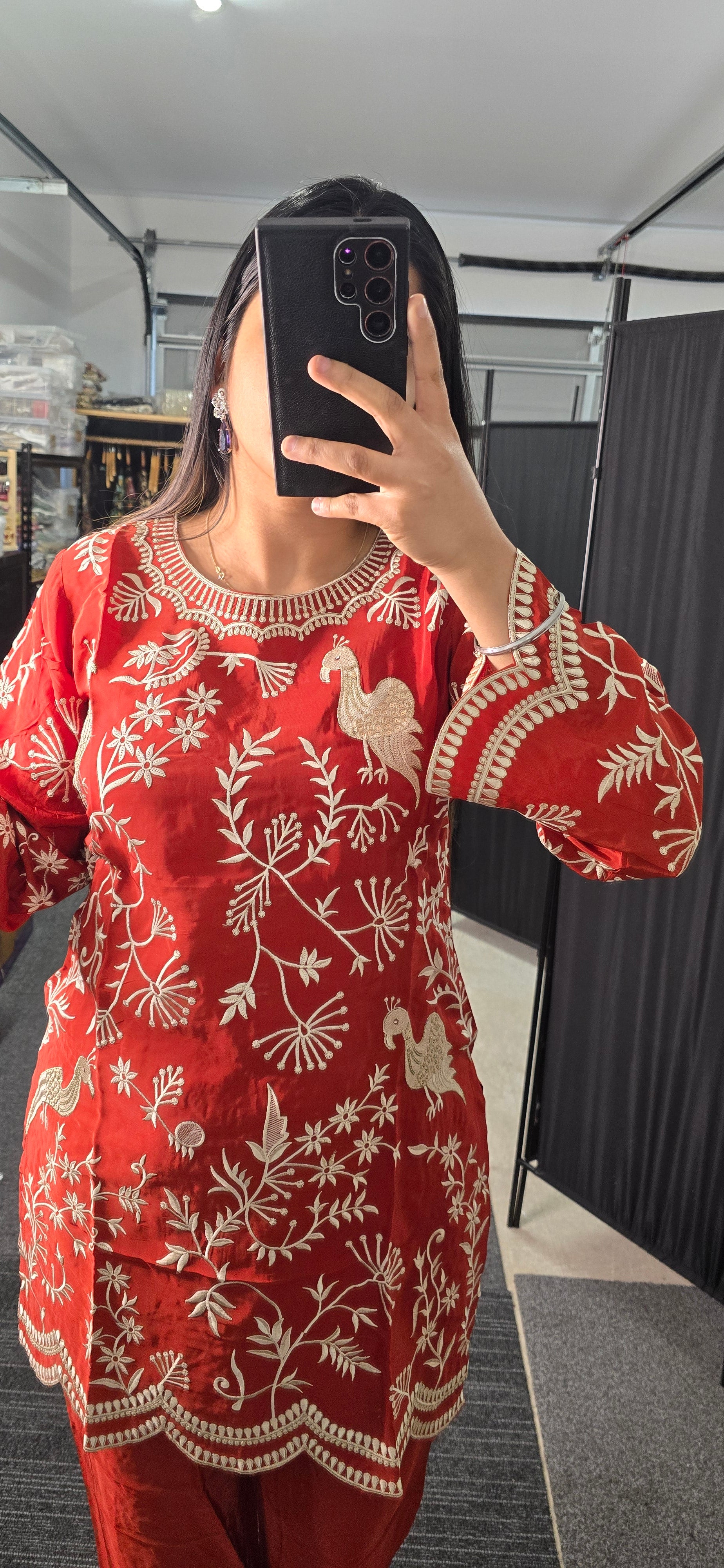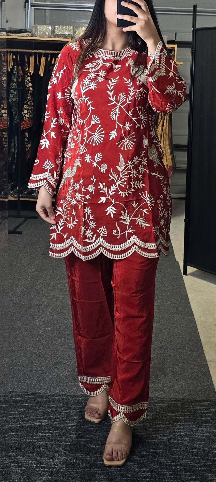 "Upgrade your wardrobe with the Russell co ord set in a stunning rusty orange color. Made from high-quality crepe fabric, this party wear set features intricate threadwork detailing on the shirt and comes with a pair of stylish pants. Perfect for any occasion, this set will make you stand out in style."