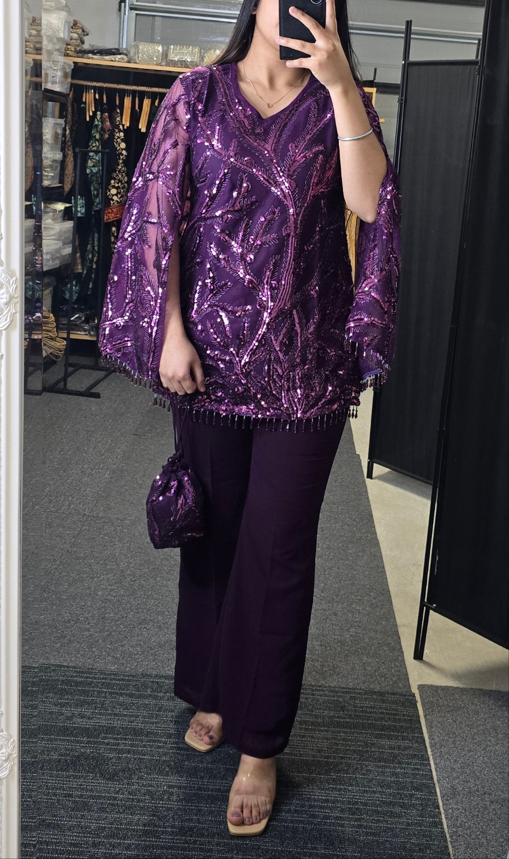 "Add a touch of elegance to your wardrobe with our beautiful purple party wear co ord set. Crafted with care, this set includes a stylish potli that completes the look. Perfect for any special occasion, feel confident and beautiful in Shiny."