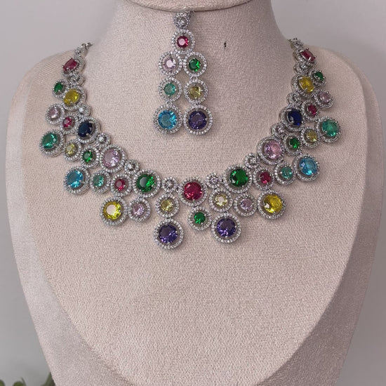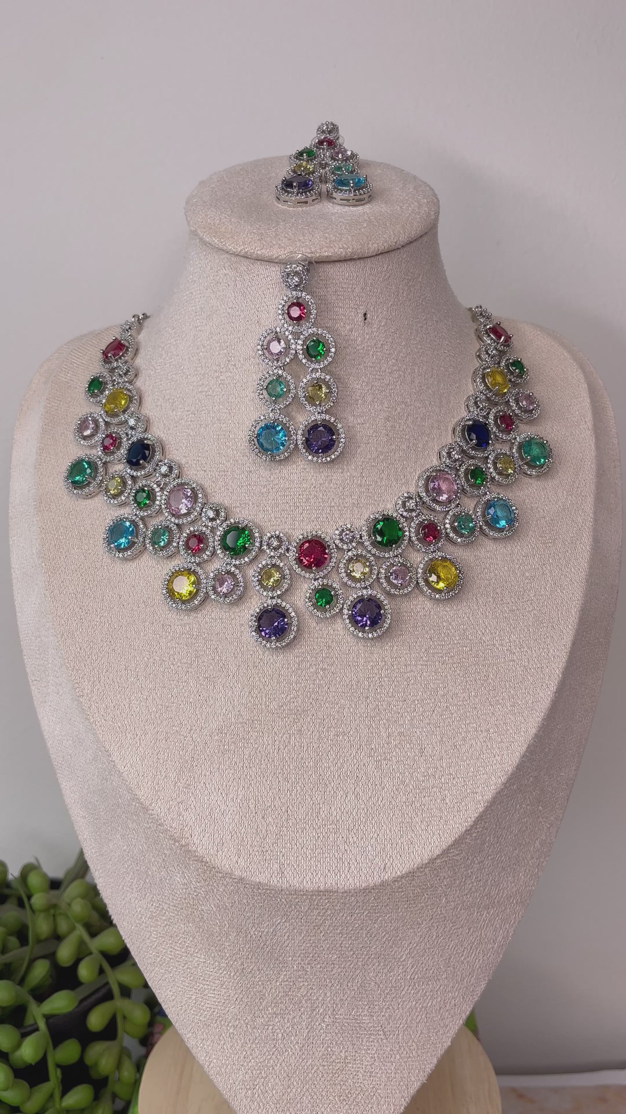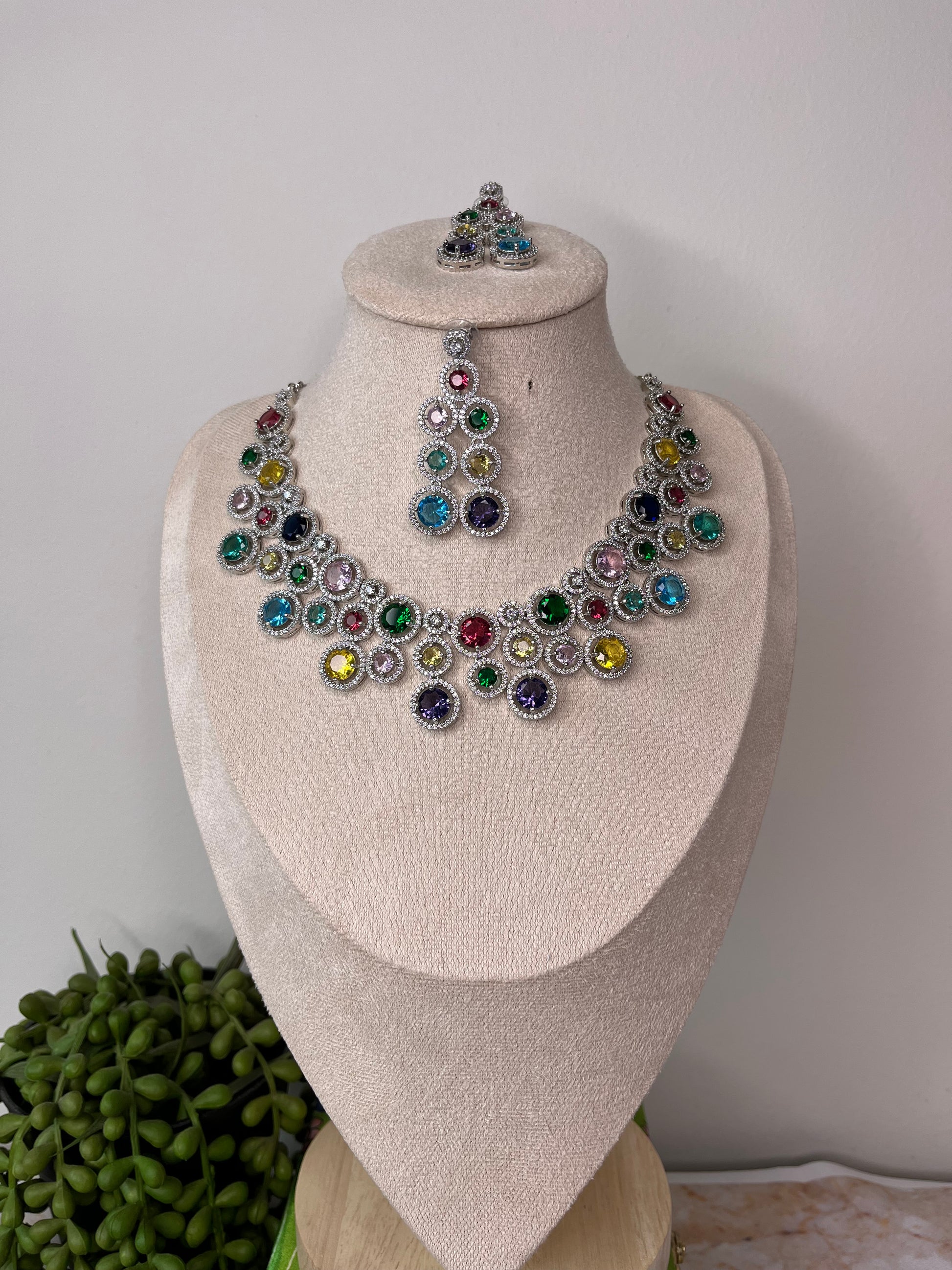 Discover our stunning American diamond set, beautifully crafted in silver and featuring a vibrant array of multi-colored stones. This exquisite jewelry piece combines elegance with a playful twist, making it perfect for any occasion. Elevate your style with this unique blend of sophistication and color, designed to catch the light and turn heads wherever you go.