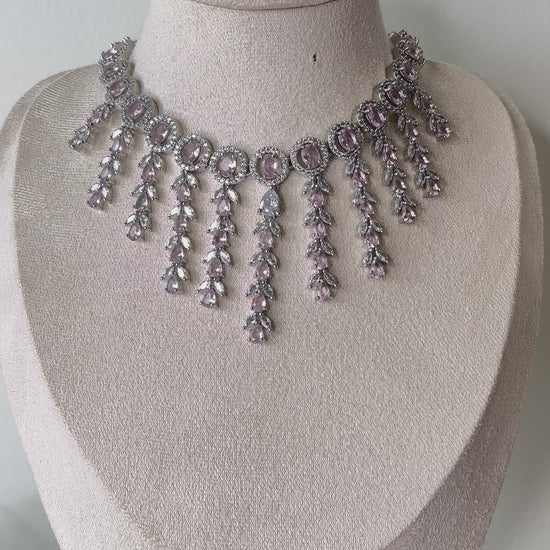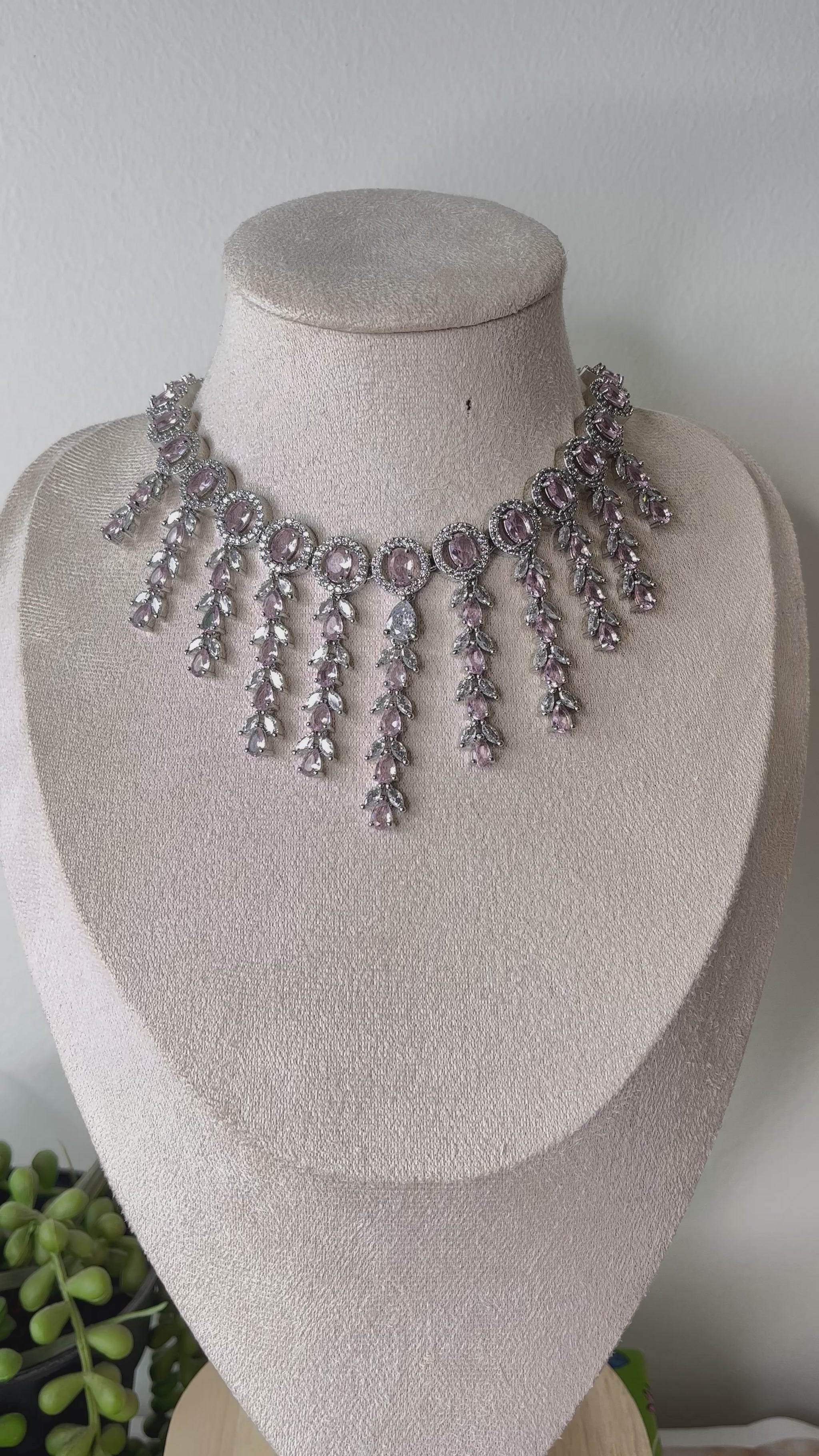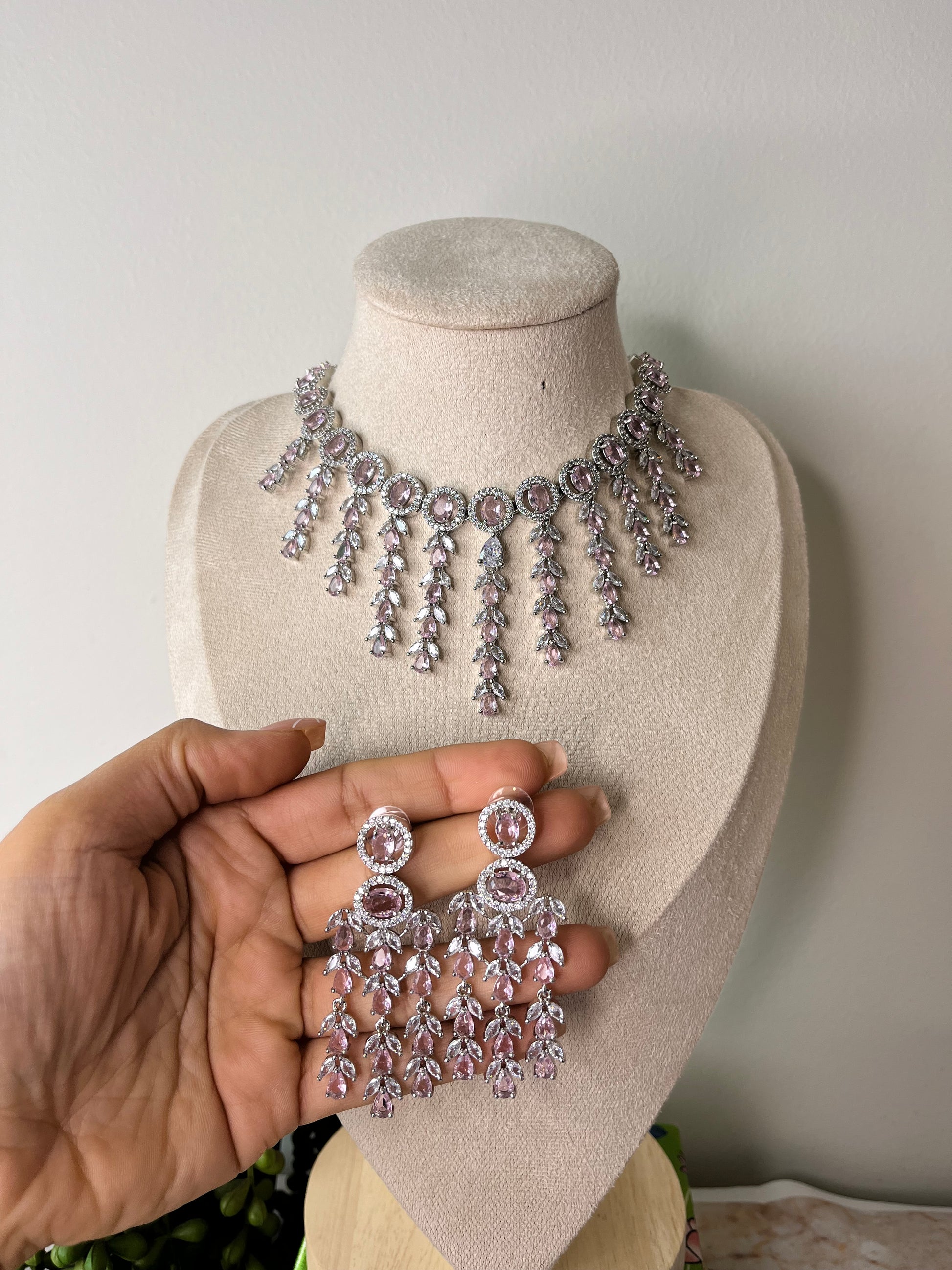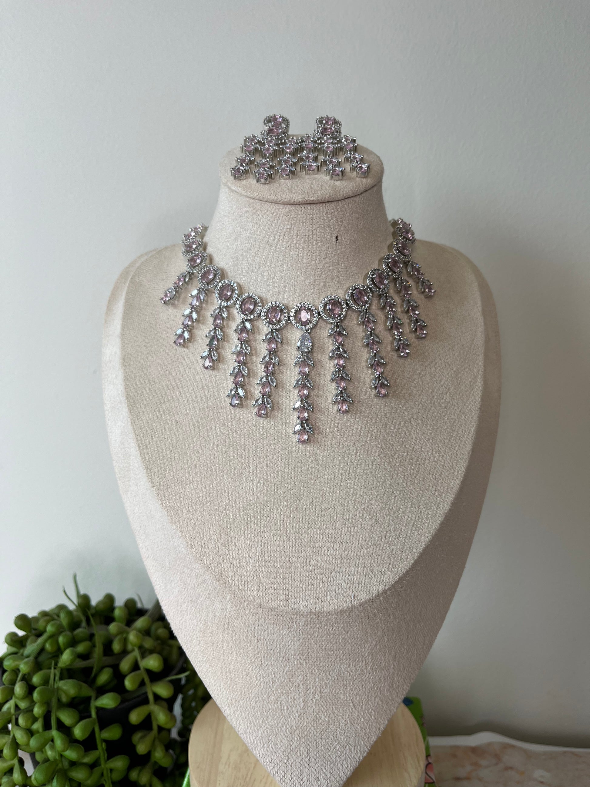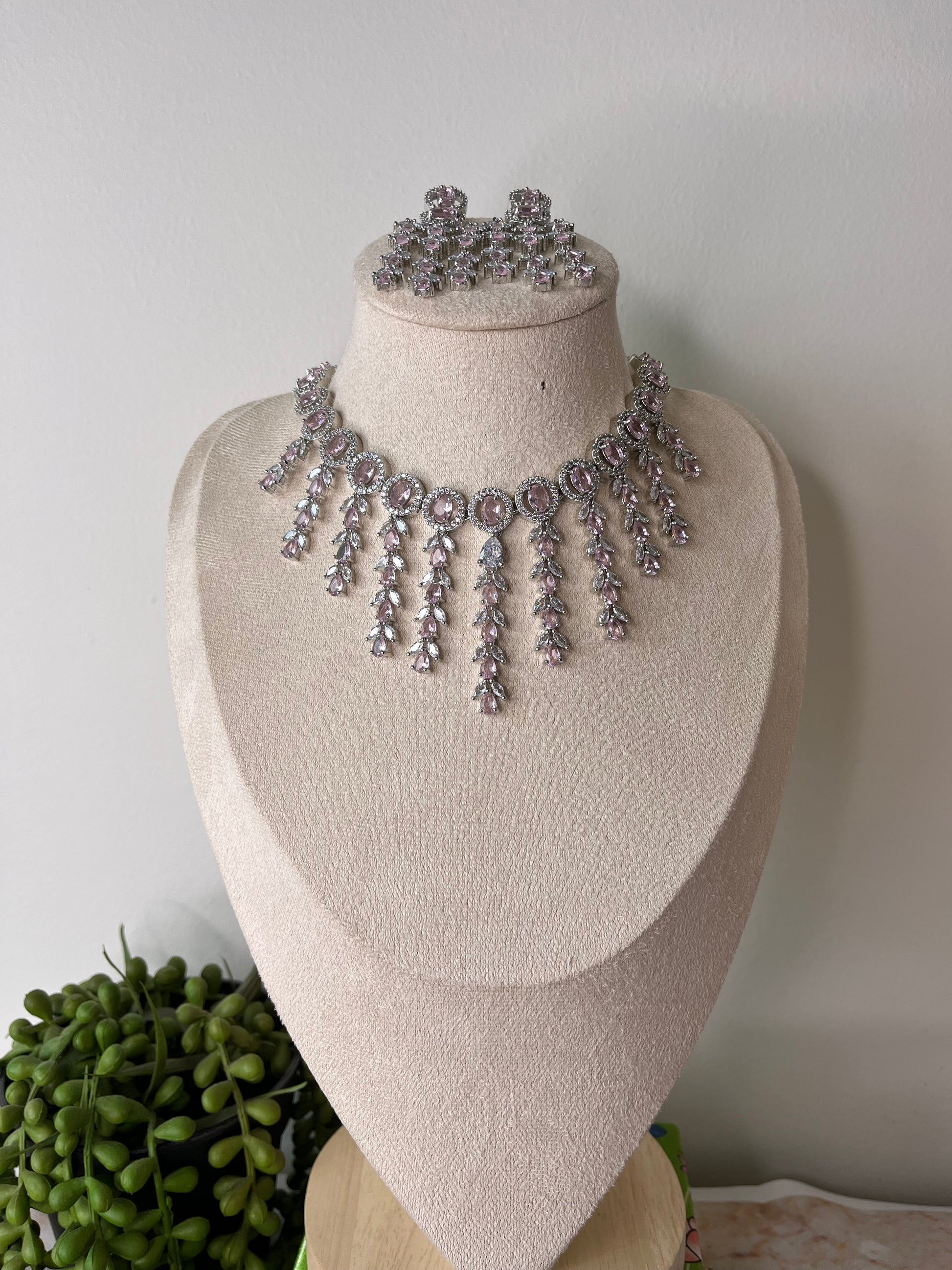 Discover our stunning American diamond set, elegantly crafted in a unique silver and pink combination. This exquisite jewelry piece features sparkling American diamonds that catch the light beautifully, set against a backdrop of polished silver. The soft pink accents add a touch of romance and sophistication, making it the perfect accessory for any occasion. Elevate your style with this captivating set that seamlessly blends elegance and modern flair.